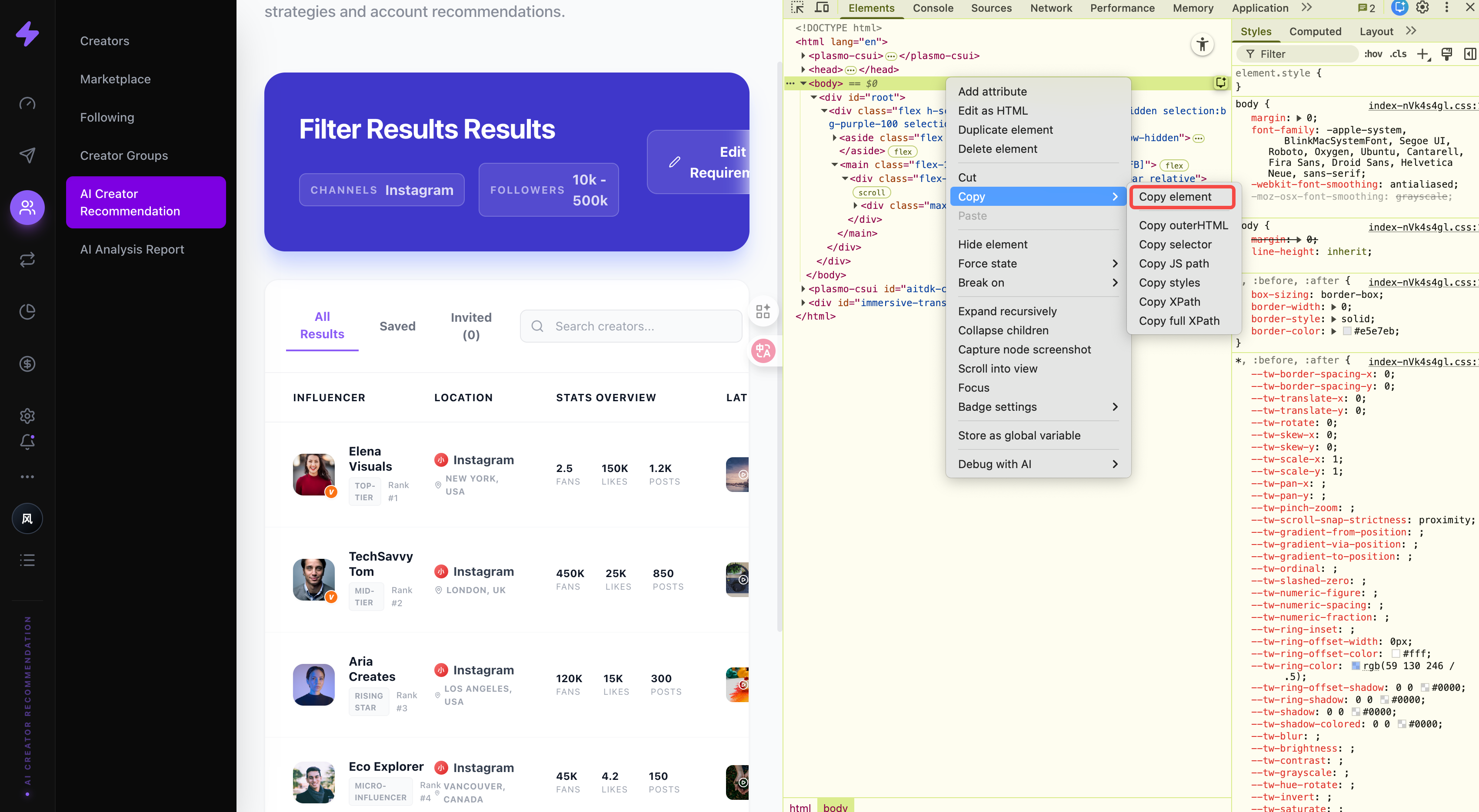 2.在开发面板中,选中并右键复制整个 <body> 元素(Copy outerHTML) 。