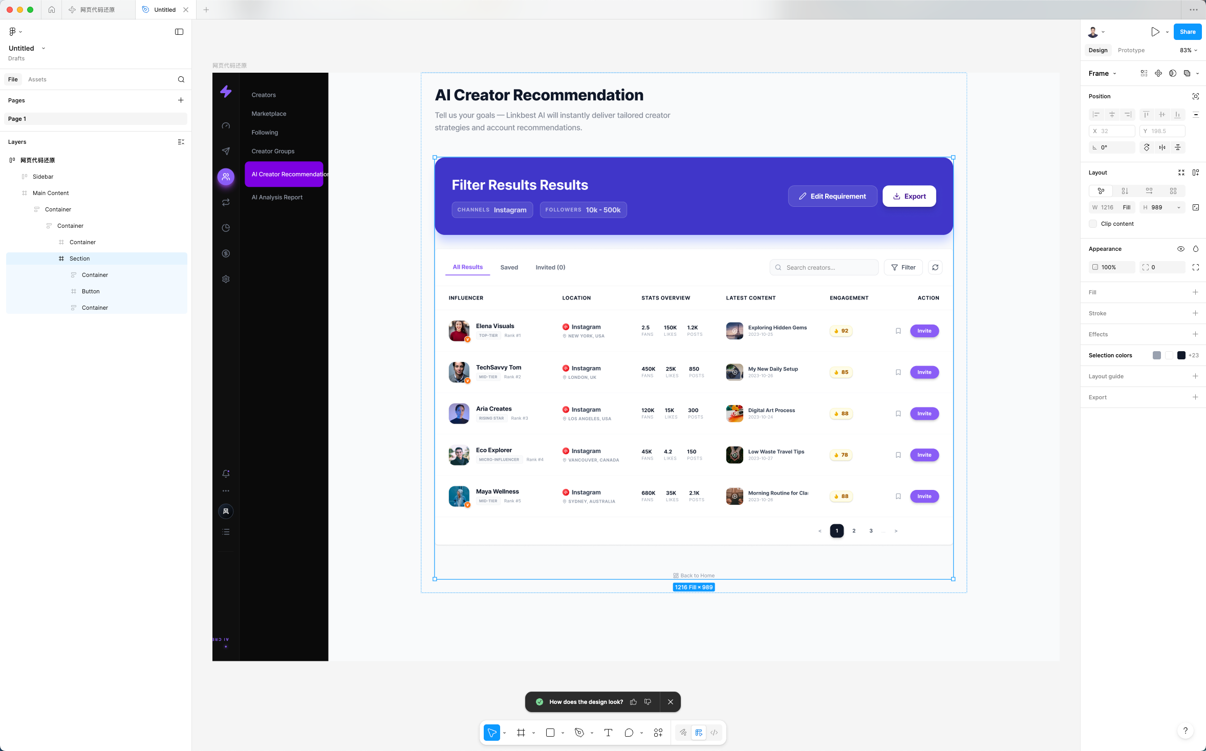 4.从 FigmaMake 导入 FigmaDesign 后,设计师即可直接调整细节并交付优化后的设计稿 。